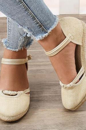 Women buckle and tie up beige woven shoes