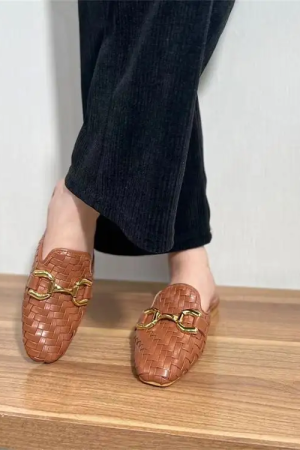 Fashion Design Comfortable Knit leather Woven Square Toe Flat woven shoes