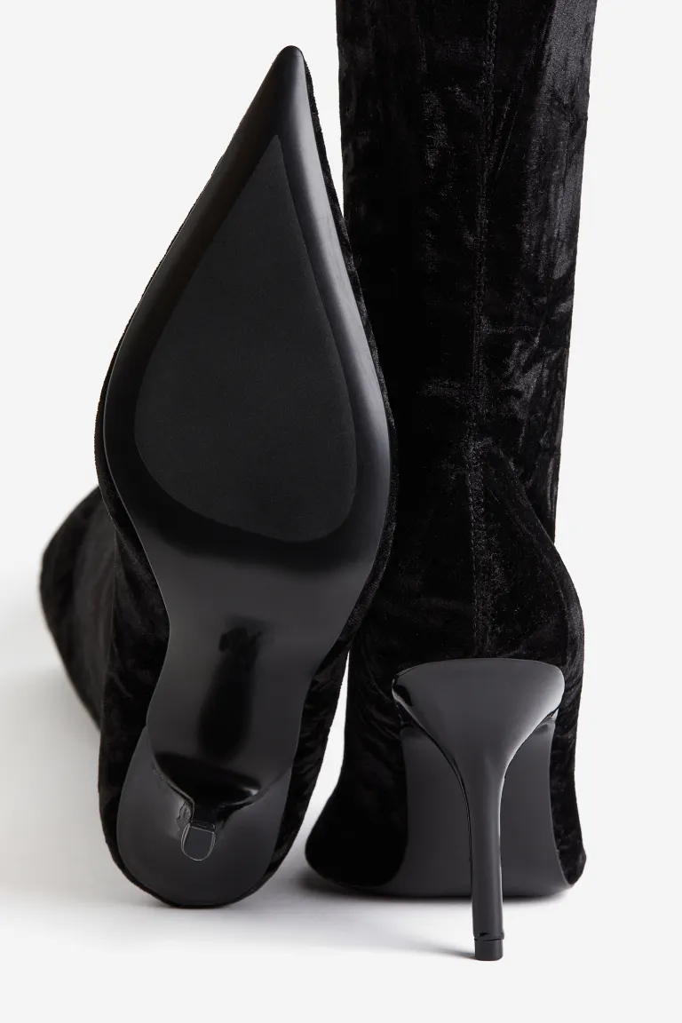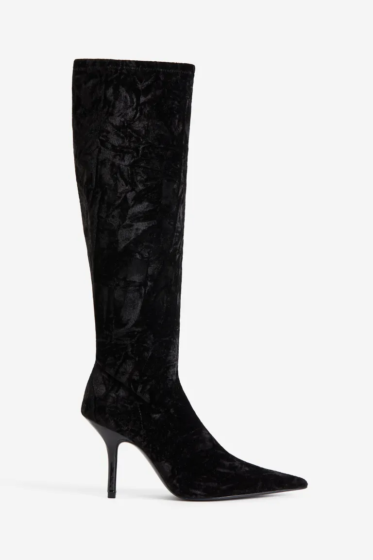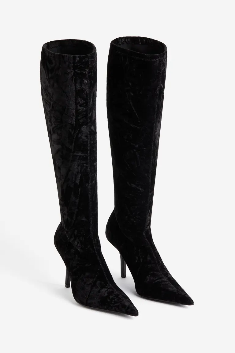 ①Knee-high boots with a fitted shaft in soft, stretchy velour. Pointed toes and thin heels.