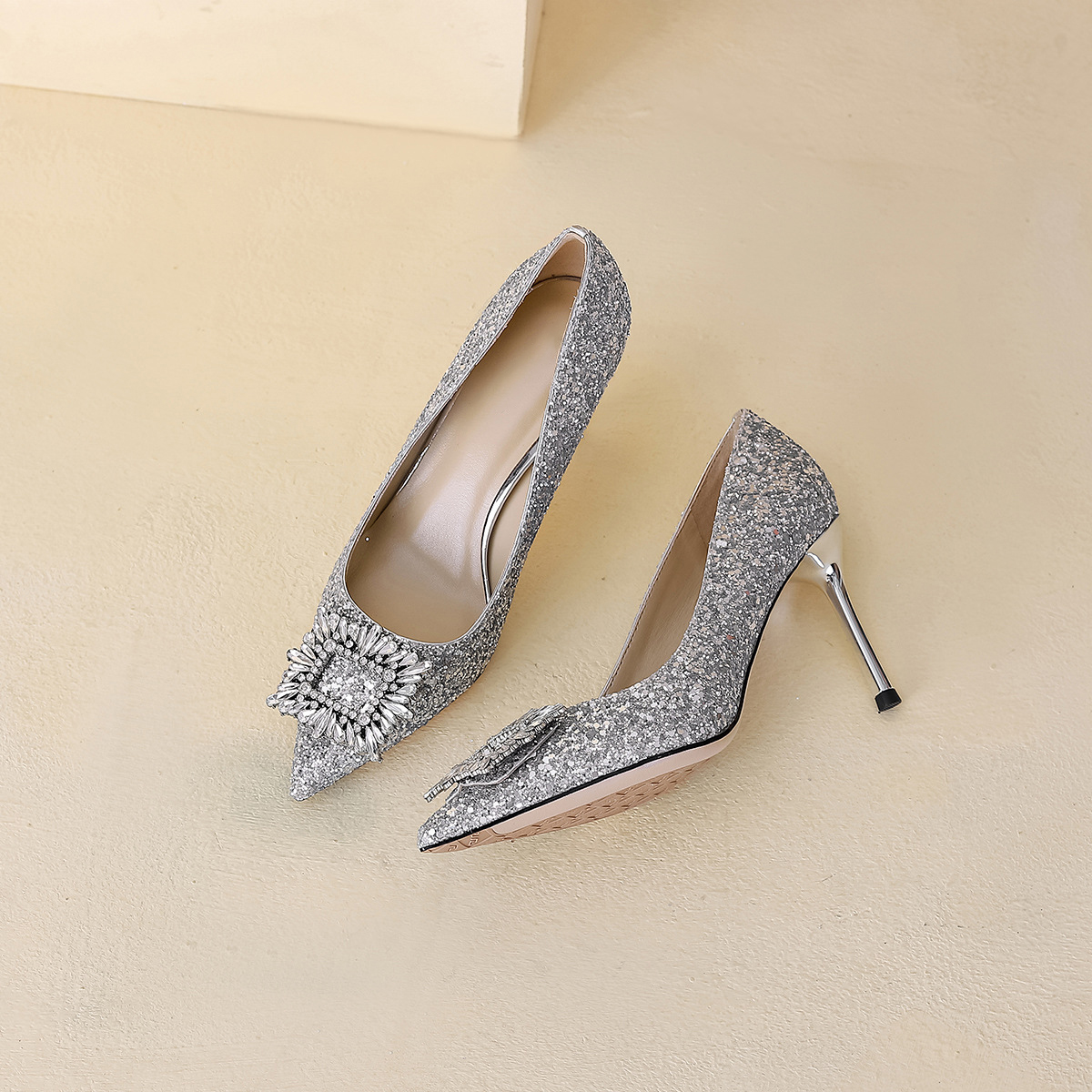 Glossy and beautiful with clear texture. Classic pointed design, upright and elegant. The exquisite rhinestone design on the heel is luxurious and understated.