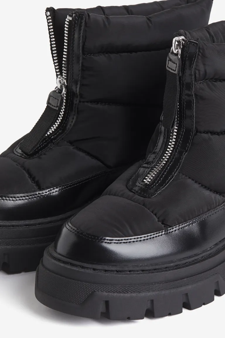 ①Warm-lined, padded ankle boots with a zip at the front and a loop at the back.